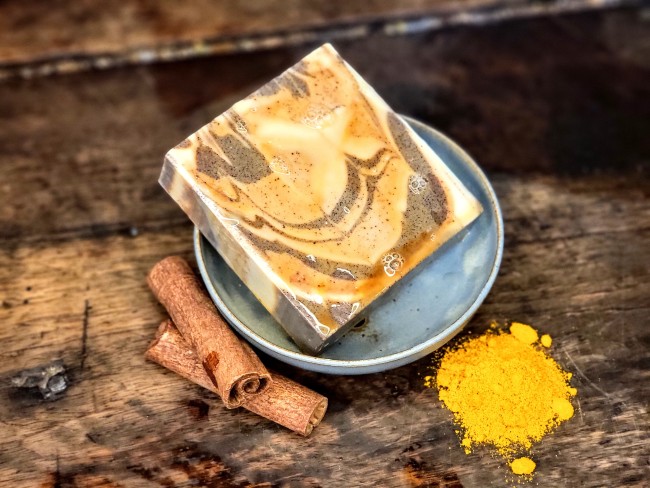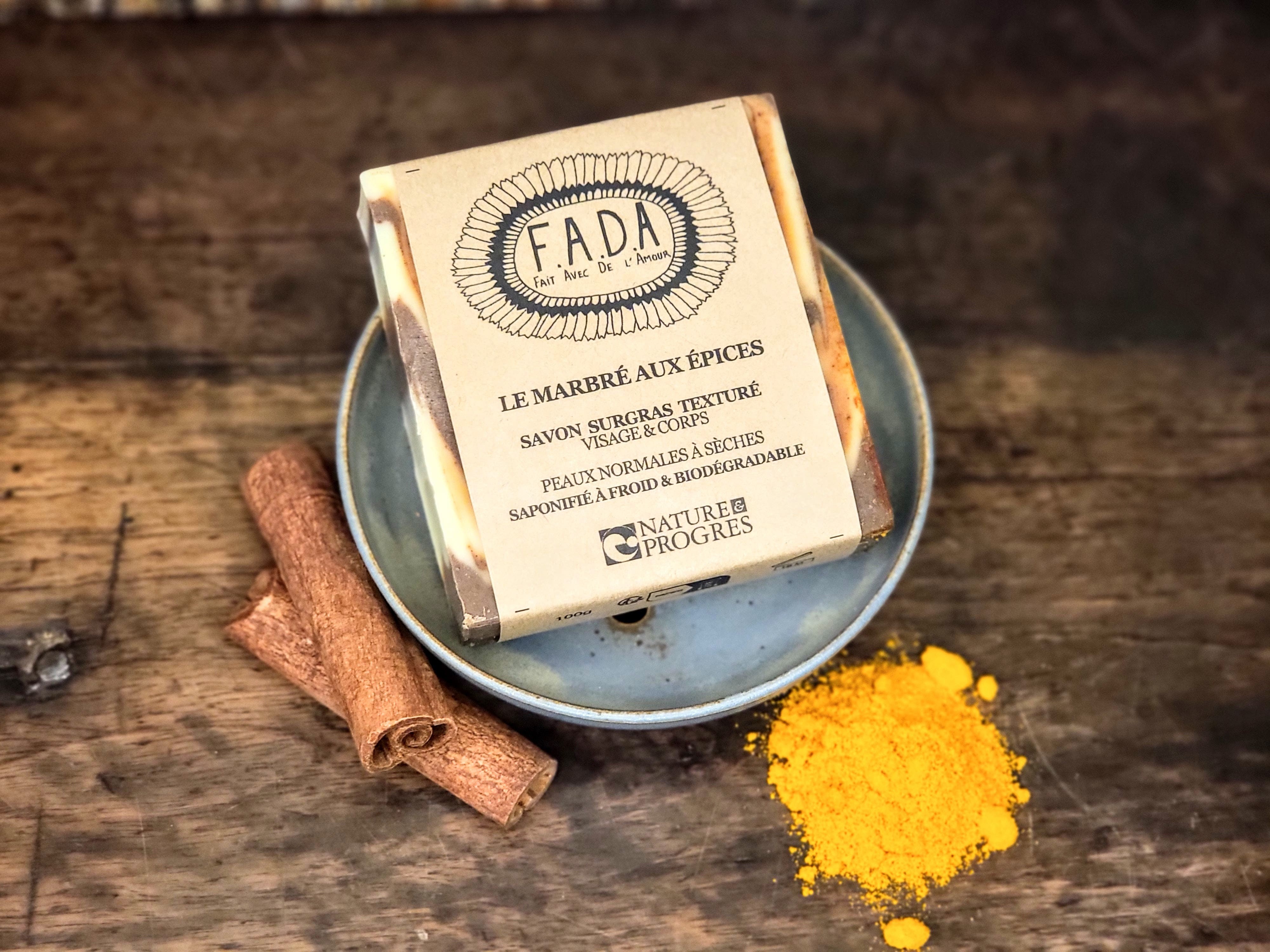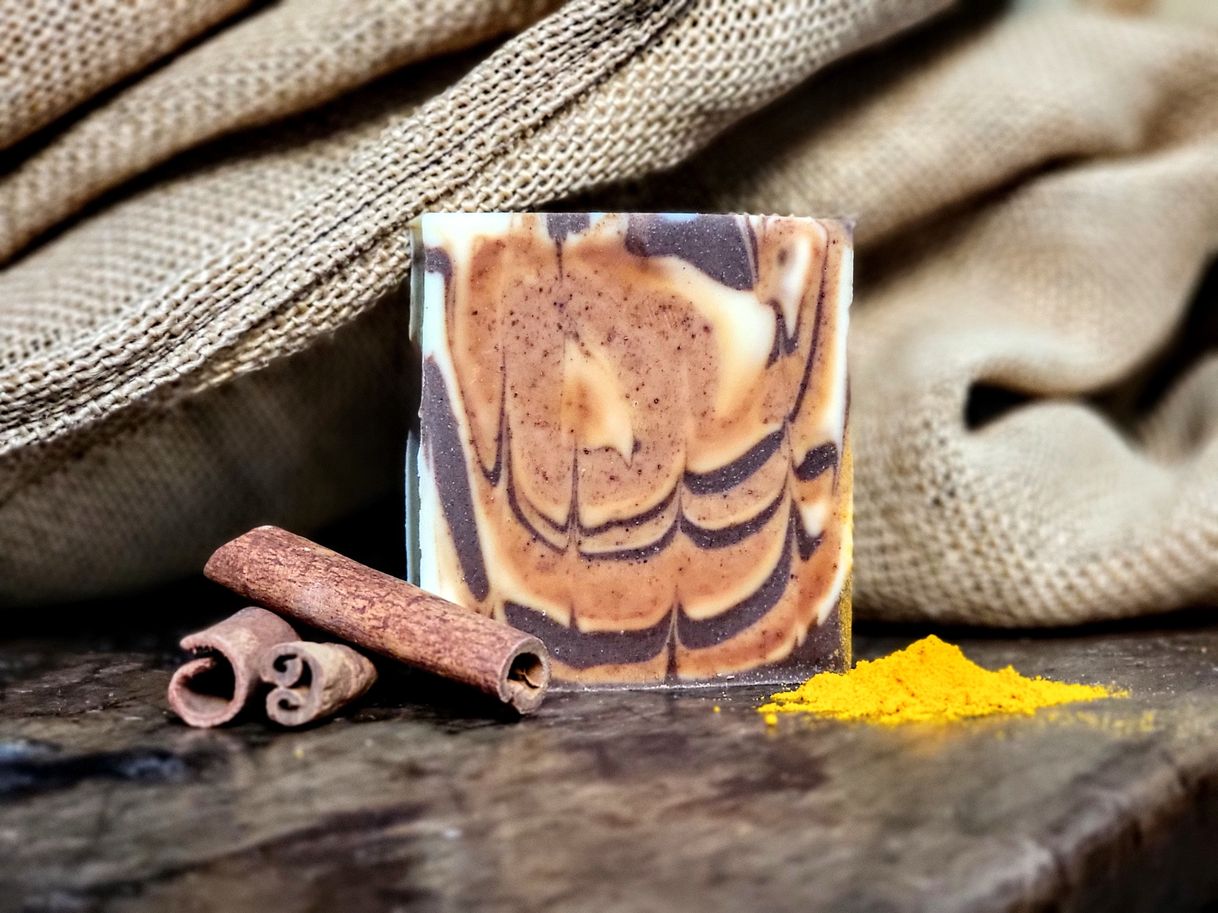 Ingrédients (INCI): sodium olivate*, aqua, glycerin, olea europaea fruit oil*, cinnamomum zeylanicum bark powder*, curcuma longa root powder*, theobroma cacao seed powder*, cinnamal* (contenu dans la cannelle)
